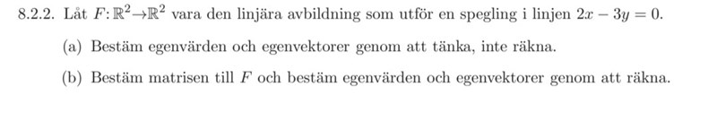 De är motsatta varandra, dvs speglingen avbildar en vektor v vinkelrät mot spegeln på -v. Vad är egenvärdet?