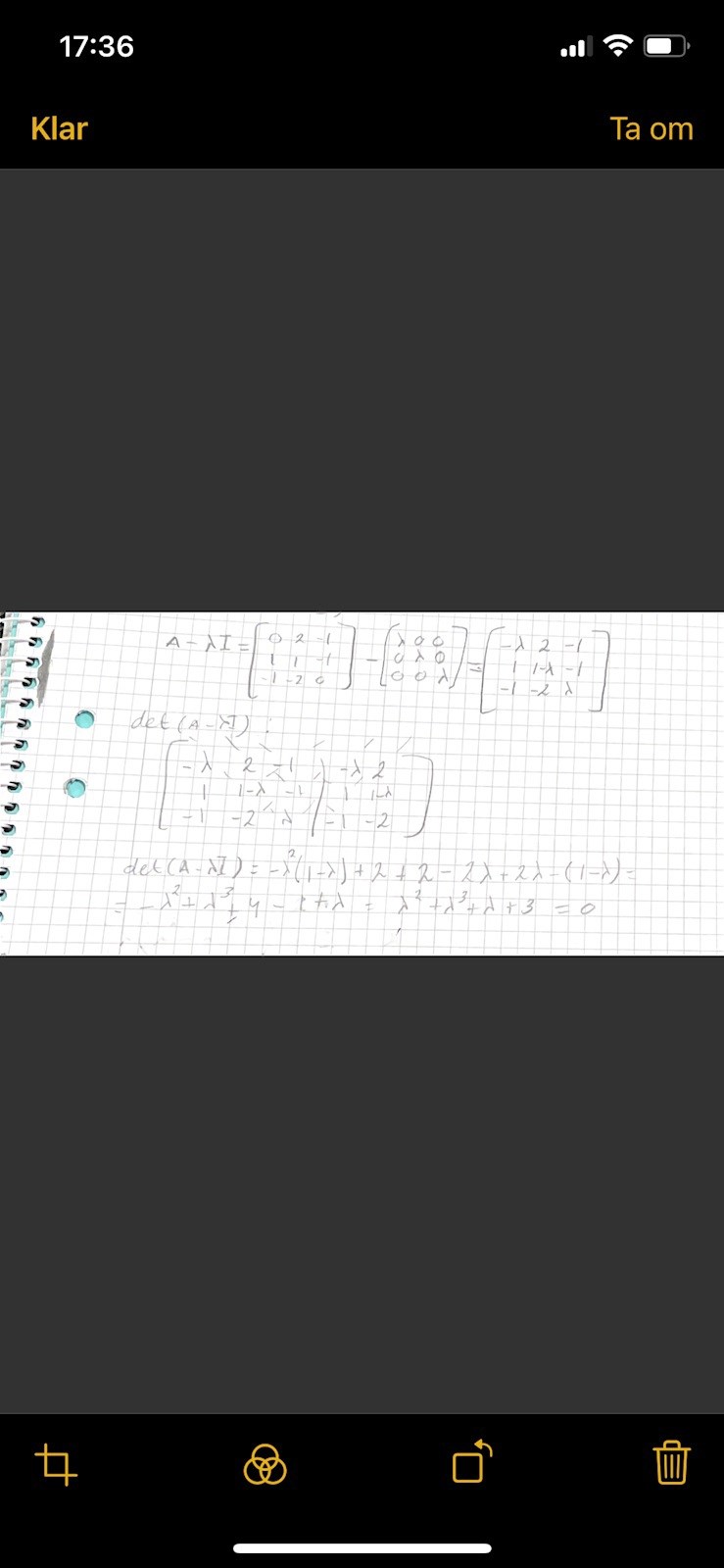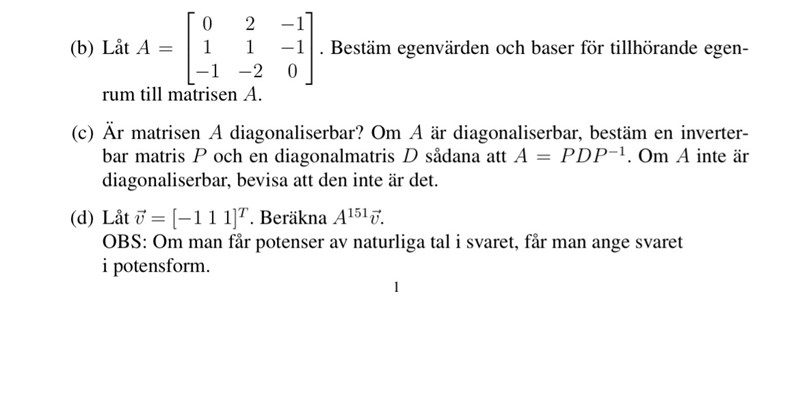 Hej! Skulle någon kunna hjälpa mig med dessa tre frågor? Jag försökte hitta egenvärde genom att sätta A-λI och sedan beräkna determinanten men jag får ett ganska svårt uttryck