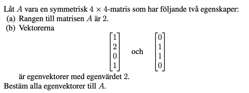Slutsats: Alla vektorer med egenvärde två är . Alla egenvektorer med egenvärde noll är . (Alla bokstäver är reella konstanter)