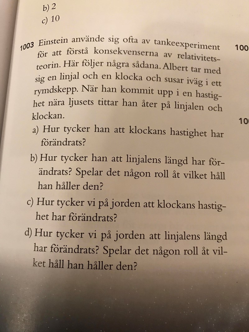 a, b) Albert är i vila relativt grejerna. De spelar ingen roll om han och grejerna befinner sig i ett rymdskepp eller om de är på jorden, utan det viktiga är att de befinner sig i vila i samma referenssystem. Svaret blir "inte alls" på båda.