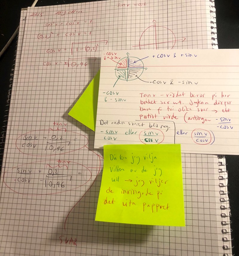 Därefter tar jag Sinv/cosv. Men jag insåg att jag får minus/plus framför sinv resp cosv. Men eftersom flera av de - sin och - cos i division ger positivt, och cosv och sinv blir också positivt valde jag att ta en av dem (dvs cosv och sin v i division)