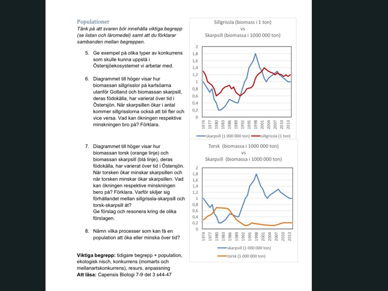 På uppgift 6 kan man tro att skarpsillen minskar eftersom de äts upp av det växande antalet sillgrisslor, men samtidigt får man komma ihåg att grafen visar antalet sillgrisslor på Karlsöarna (två väldigt små öar). Det är alltså inte troligt att det finns så många sillgrisslor att de kan minska populationen skarpsill i hela Östersjön så pass kraftigt.