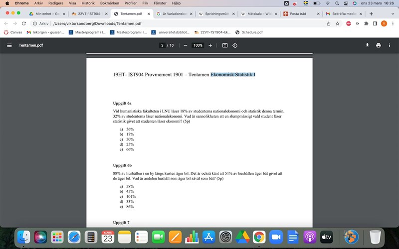 a) Tänk dig att det är totalt 100 studenter som läser vid LNU. Då är det 32 studenter som läser nationalekonomi, och 18 av dessa läser även statistik. Hur många % av nationalekonomistudenterna läser även statistik?