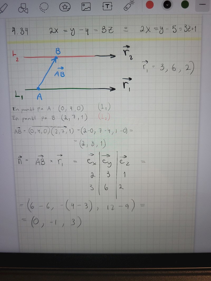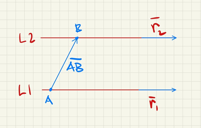 Menar du att eftersom det inte gick att ta fram kryssprodukten på de parallella linjerna så du skapade istället en vektor AB? Så AB kryssprodukt med r1 bildar normalvektorn?