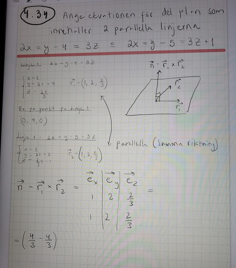 PATENTERAMERA skrev:offan123 skrev:Jag har försökt men insett eftersom båda är parallella fungerar inte kryssprodukten som metod då koordinaterna cancellerar varandra.