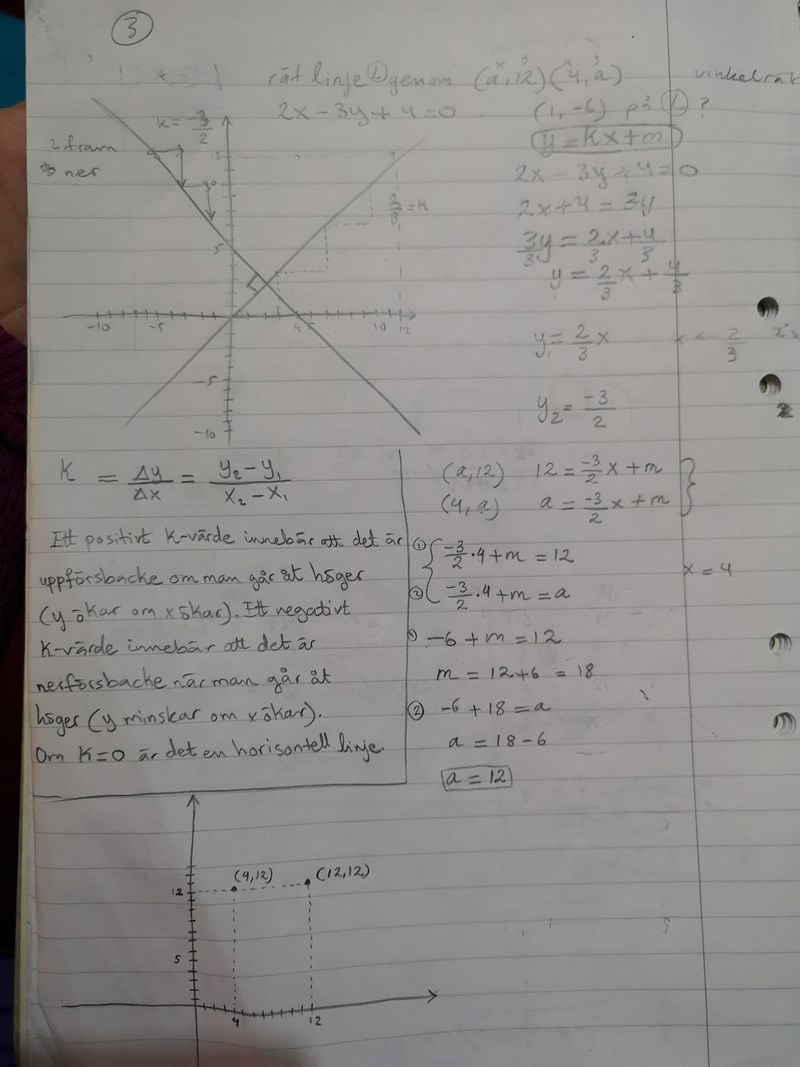 Nej alla har y-värdet överst, annars har man gjort fel, som jag verkar ha lyckats med högre upp. De två k-värdena 2/3 och -3/2 ser olika ut för att de tillhör olika linjer, som är vinkelräta mot varandra, eftersom 2/3*(-3)/2=-1