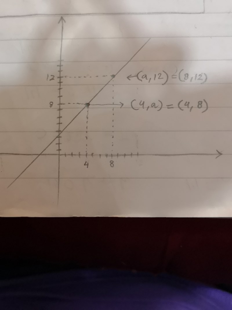 Jag tror; fått väl ut värdet på a, så sätter jag in a i punkterna (a,12) eller (4,a) i y=kx+m för att räkna ut m.