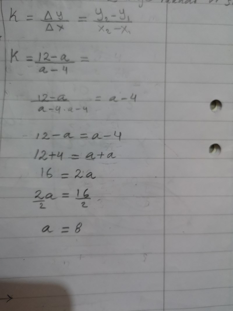 Det du har skrivit här har inget med den här uppgiften att göra. Du skall lösa ekvationen , där k är riktningskoefficienten för den linje som är vinkelrät mot linjen 2x-3y+4=0. Då får du fram ett värde på a, och när du sätter in det får du fram de riktiga koordinaterna för punkterna (a,12) och (4,a).