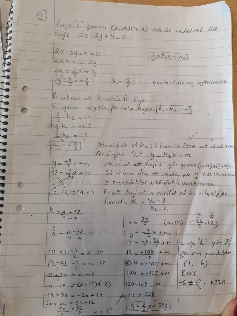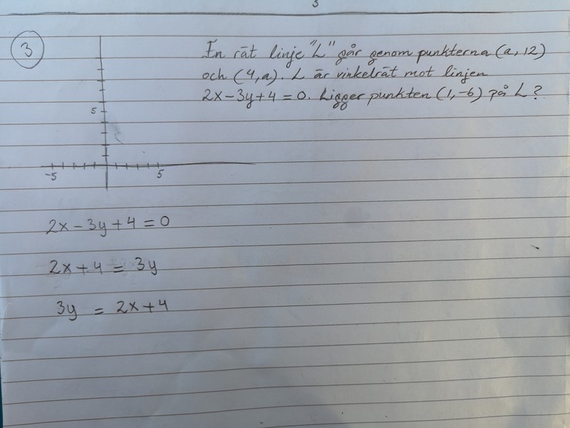 Börja med att skriva linjen 2x-3y+4=0 på formen y=kx+m. Då får du fram ett k-värde. Eftersom du vet att linjen är vinkelrät mot denna linje, kan du räkna fram k för linjen eftersom .