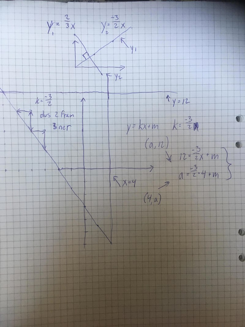 😐😐😐😐 Du fick fram ett mycket komplicerad värde på a! Hur ska du rita linjen med detta? Jag ville ta ut a värdet exakt först för att veta i vilka punkter den vinkelräta linjen går igenom, (a, 12) o (4,a)