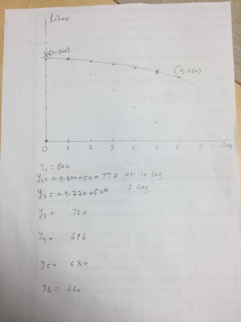 Det är nog tänkt att du ska skriva en ekvation för detta. Kalla vattenmängden en viss dag för V. Börja med hur mycket som rinner ut, hur kan du uttrycka 10% av vattenmängden V? Hur kan du uttrycka att det läggs till 50 liter vatten varje dag?