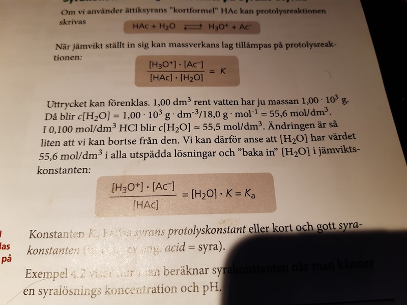 Det är fullt rimligt att anta att du kommer ihåg från Ke1 att c=n/v och hur man beräknar molmassan för vatten. Hade den här uppgiften varit i Ke1 när man lär sig använda den formeln hade man nog tagit med några extra steg. Här är det ju bara ett litet steg i förklaringen till varför man förenklar jämviktskonstanten lite genom att anse att koncentrationen av vatten är konstant så att man kan införa syrakonstanten Ka och baskonstanten Kb.