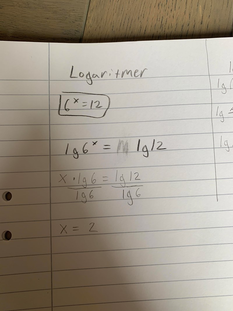 Har du provat att räkna ut logaritmerna var för sig? lg(12) är ca 3.58 medan lg(6) är ca 2.58. Och 3.58/2.58 är ju inte 2.