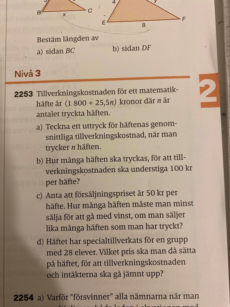 c) Det kostar att trycka n häften. Om vi säljer a häften kostar det kr att tillverka häftena, och vi får in kr från försäljningen.