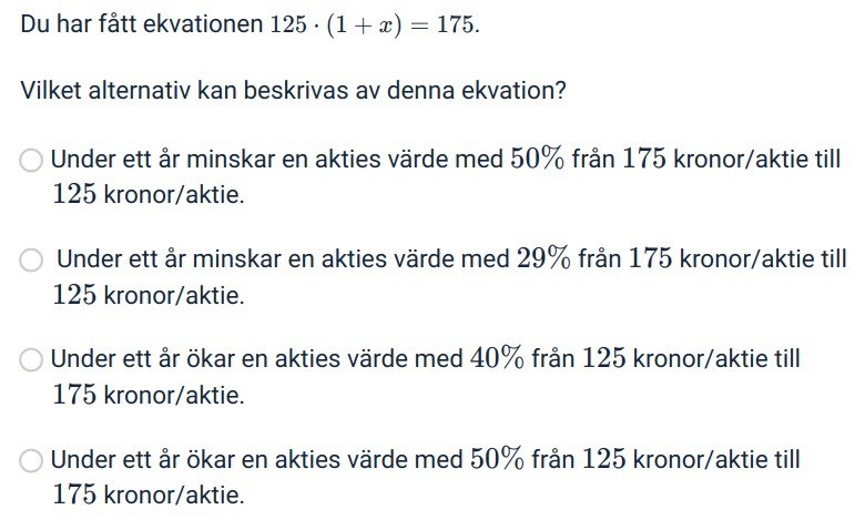 Ekvationen beskriver hur 125 ökar från 125 till 125(1+x). Det är en ökning från vad den var från början (125) med ett tillägg (+125x) . Det kan därför inte vara alternativ 1 eller 2, men kanske 3 eller 4. Pröva vilket som stämmer av dem.