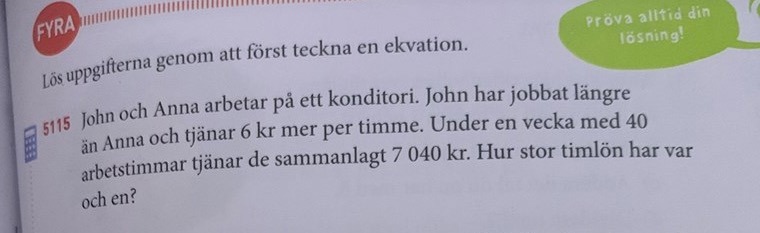 Om vi väljer att sätta Annas timlön till x, så kan vi då sätta Johns timlön till (x+6)