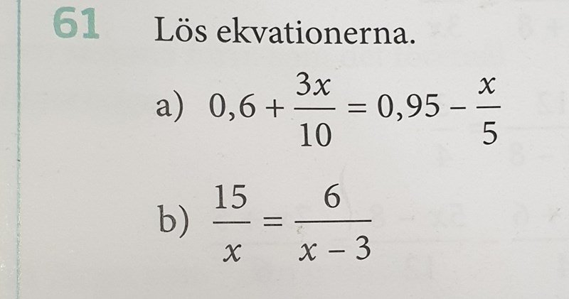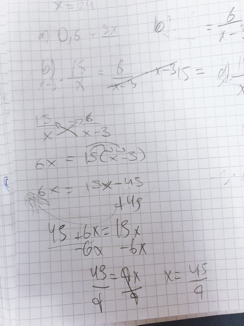 Här har min bror hjälpt mig lite men jag fattar inte. Får man byta plats på 45 som han gjorde? Det var 6x = 15x - 45 sen gjorde han 45 + 6x = 15x. Går det att flytta på talen? Är det rätt?