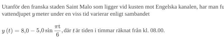 En sinusfunktion varierar mellan -1 och 1, då inser man lätt (?) att vattendjupet varierar mellan 8-5 och 8+5 meter.