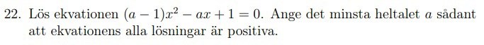 Så länge ekvationen är en 2:a-gradare så har den x1 också x2 som lösningar. Men kolla vad som händer när du sätter a=1. Då blir ekvationen linjär. 2:a-gradstermen försvinner och det finns bara 1 lösning (och den är positiv).