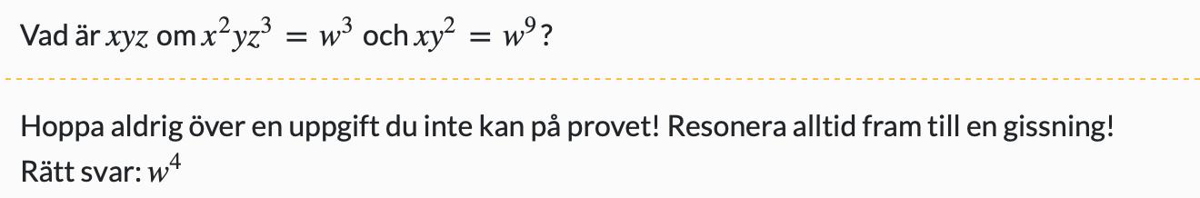 Du vet att x2yz3 = w3 och att xy2 = w9. Du vill ha fram nånting som är xyz. Om du multiplicerar ihop de båda ekvationerna ledvis får du x3y3z3 = w12, d v s (xyz)3 = (w4)3 så xyz = w4.