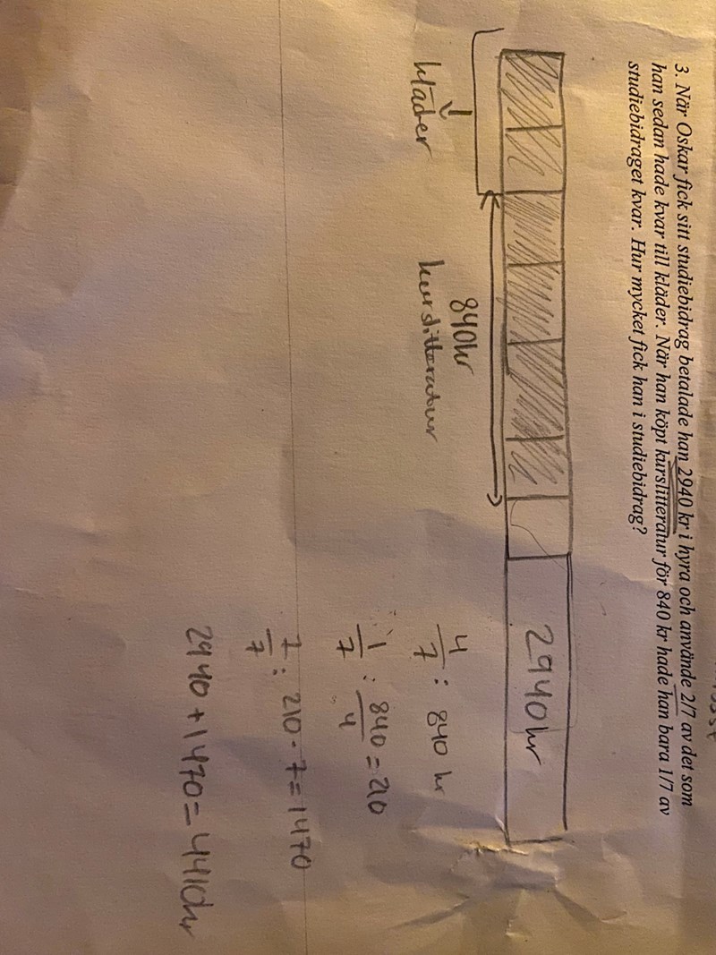 3. Det sista vi får veta är att han sedan köpt kurslitteratur för 840kr och att han har kvar 1/7 av studiebidraget.