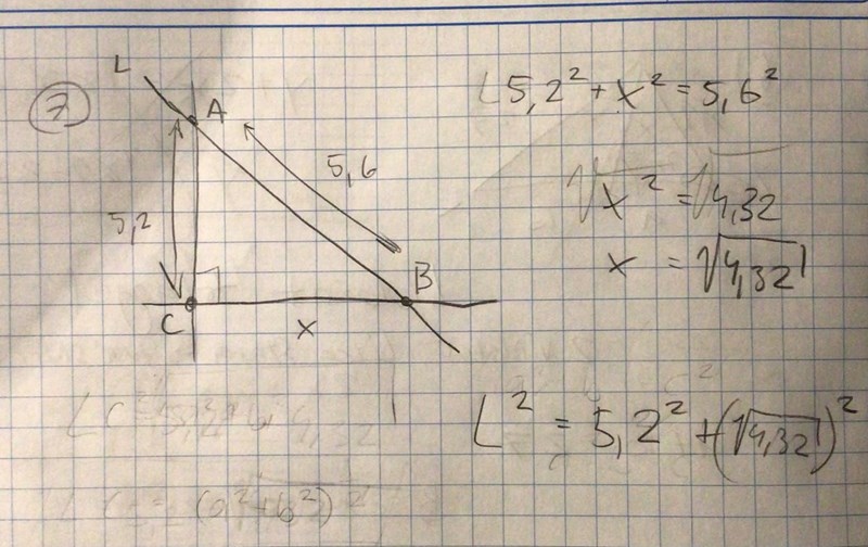 L^2 = 5,2^2 + (4,32^1/2)^2 (då jag tidigare kom fram till at x = 4,32^1/2)