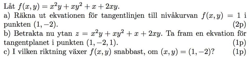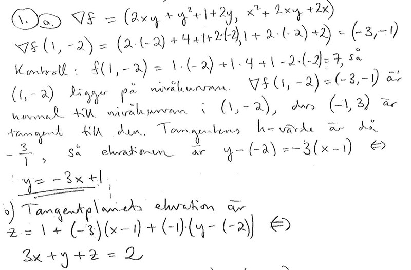 I uppgift a) bestämde du Därifrån kommer 1:an och 3:an. Om det känns mer bekvämt kan du istället studera nivåytan till . Tangentplanet i punkten ges av