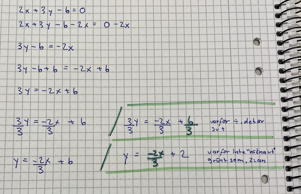 Här har jag stegen från (a) till (g). En sak som jag alltid undrar över när jag kommer till den delen är på del (d) och del (f). Varför tar man subtraktion på (d) 2x när det står 2.x alltså varför dividerar man inte de precis som man gör på del (f) 3y? det är ju samma sak..