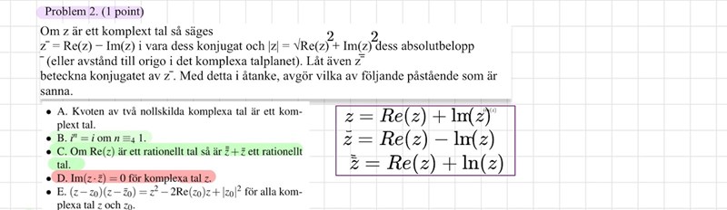 Hej! Jag vet inte hur ska man lösa denna ekvation har försökt men kommer inte fram till om likheten gäller. Tycker det är svårt när man uttrycket det som im(z) & re(z) istället för a & bi. Kan man lösa & räkna med a & b istället och sedan kolla i ekvationen? utvecklade VL. & stryckit z^2 pga finns i VL & HL.