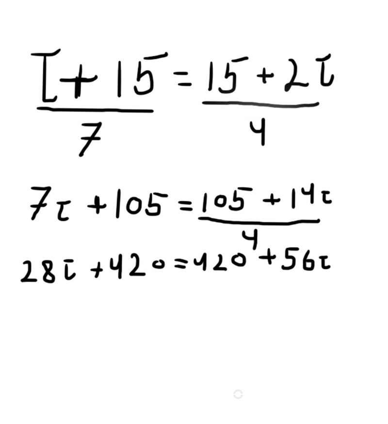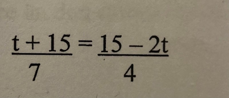okej det du gör är att du multiplicerar täljaren  t+ 15 med 4 och sen lägger du likhetstecken och multiplicerar 7 med 15-2t och sen räknar du ut det som en ekvation