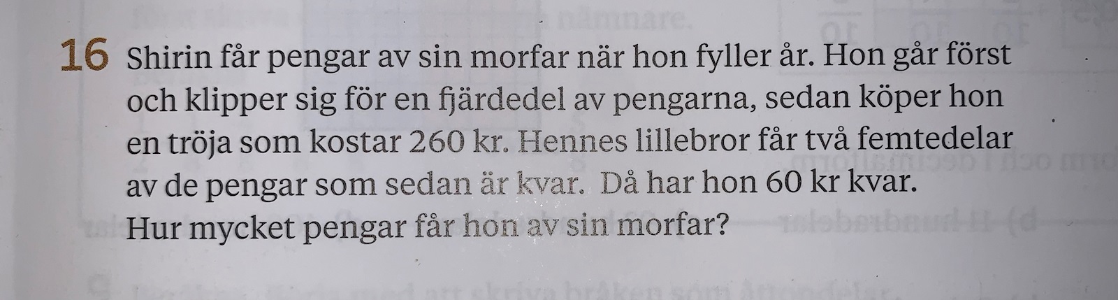 Annars kan man räkna bakifrån. När hon har givit sin bror en del av pengarna, har hon kvar 3/5 av pengarna som var kvar när hon hade köpt tröjan. Det är 60 kr, så när hon hade köpt tröjan hade hon ...