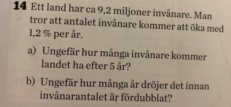 Det är b som jag inte förstår. Jag har tänkt att när invånarantalet är fördubblat så är det 18.4 miljoner invånare. Utifrån det ställde jag upp ekvationen