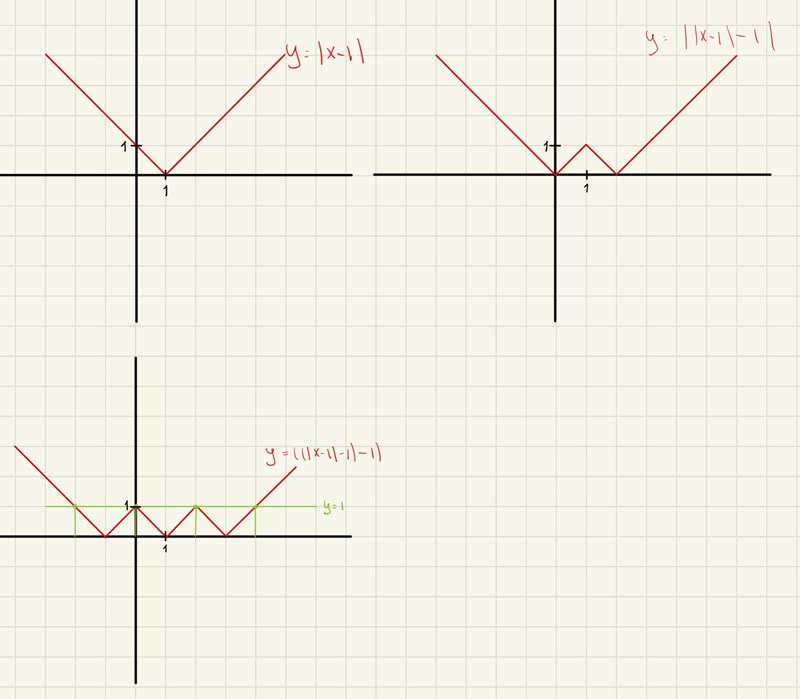 Vi börjar med att rita en graf som visualiserar vänsterledets värde, dvs vi ritar grafen till y = |||x-1|-1|-1|.