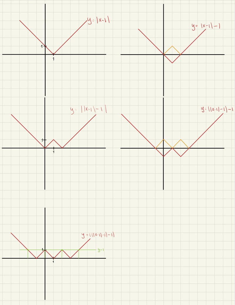 Börja med att rita |x-1|. Rita sedan med hjälp av den grafen |x-1|-1. Rita sedan med hjälp av den grafen ||x-1|-1| o.s.v.
