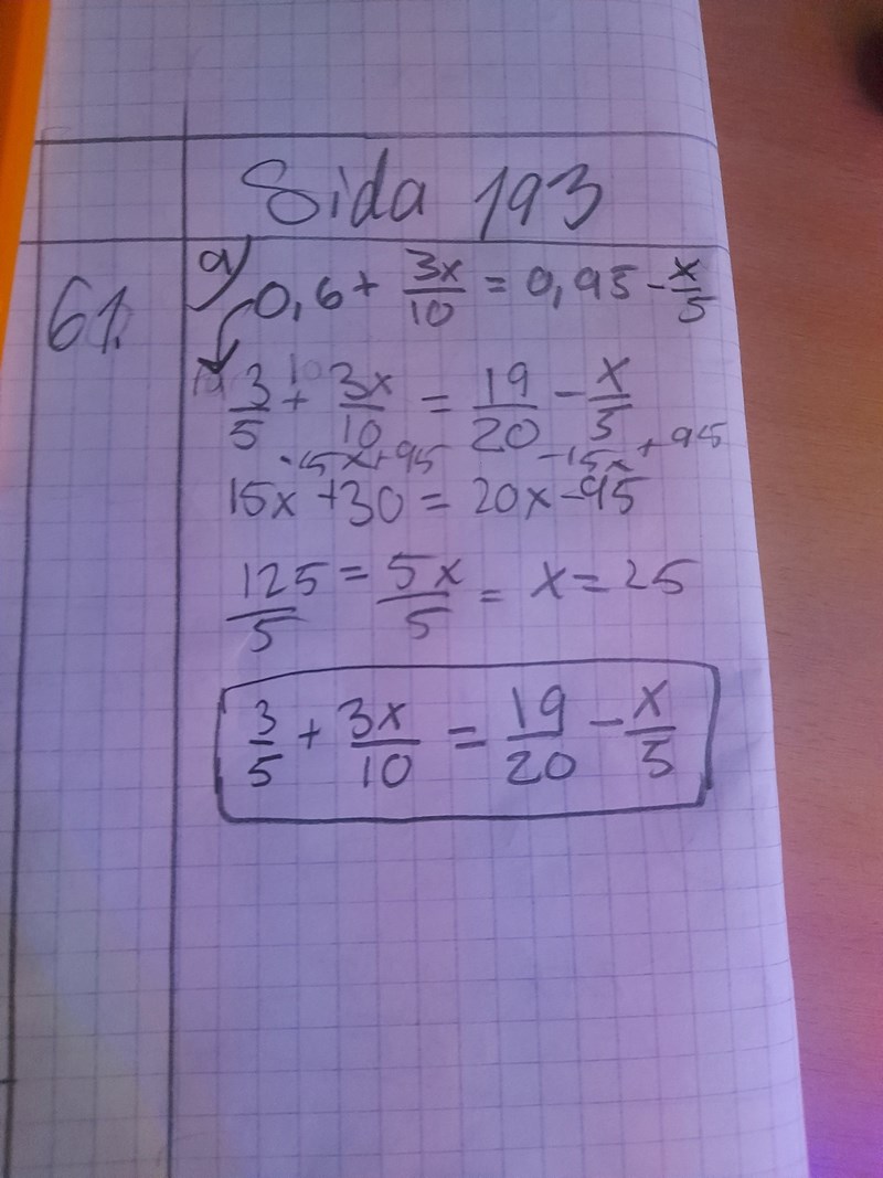 Ett annat sätt att lösa den ekvationen är att börja med att multiplicera både VL och HL med 10. Jag tycker det är enklare!