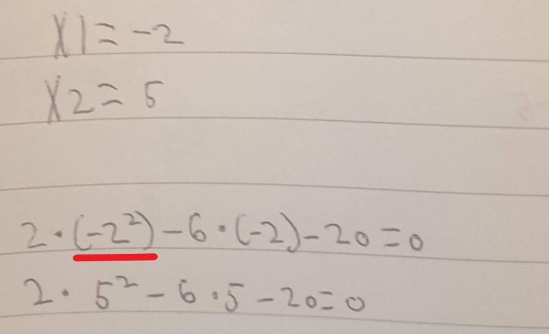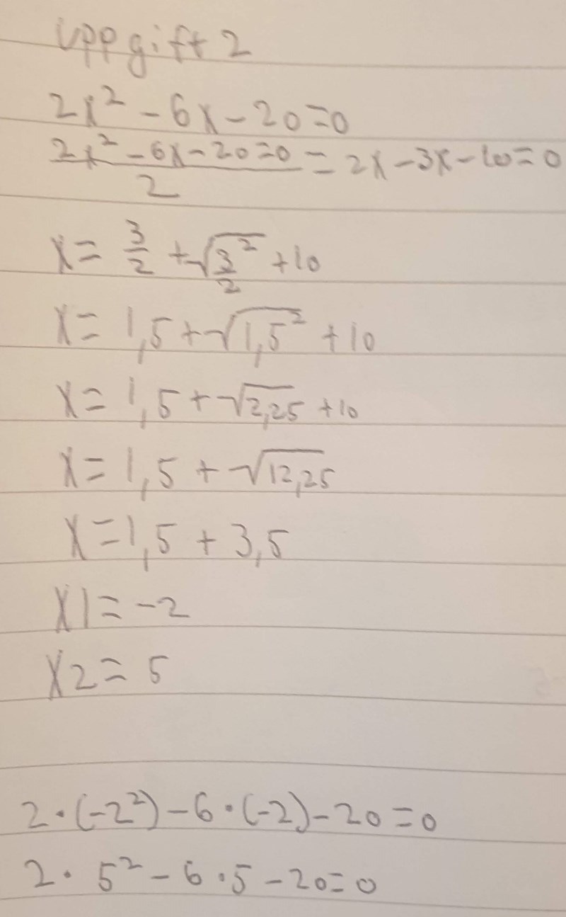 Uppgiften är "Lös ekvationen 2x^2 - 6x -20 = 0"