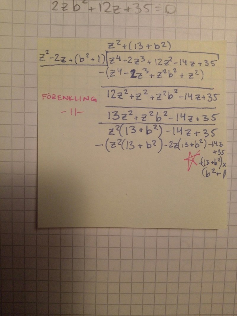 smaragdalena skrev :Nej. Dividera med . Det skall gå att hitta ett värde på b som gör att det inte blir någon rest.