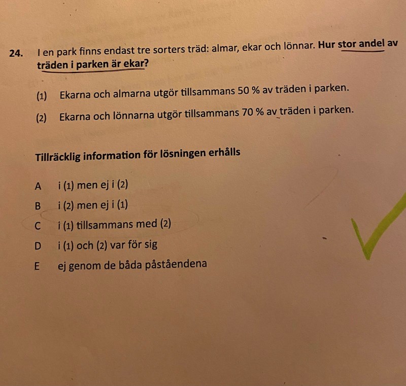 Och sen kan man lösa ut E i de båda ekvationerna och då får jag (1) E=0,5T-A och i (2) E=0,7T-L och sedan kan man göra en ekvation av dessa genom att ta 0,5T-A=0,7T-L och sen förstår jag inte vart jag ska komma med allt detta… Hur ska man göra för att besvara frågan ”Hur stor andel av träden i parken är ekar?”