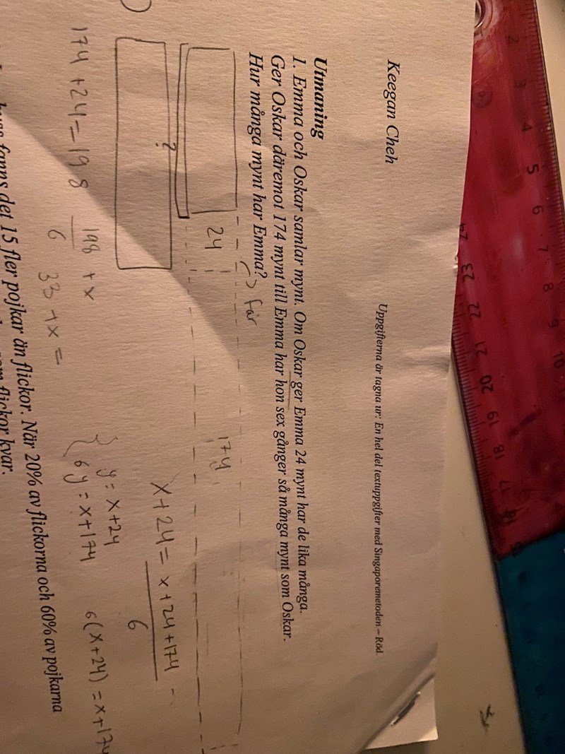 Om oskar ger 24 kr till emma och de då har lika mycket får vi uttrycket