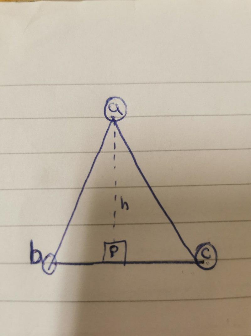 Sätt ut lite namn på punkter i figuren: hörnen får heta A, B och C. Punkten där h möter basen får heta P.