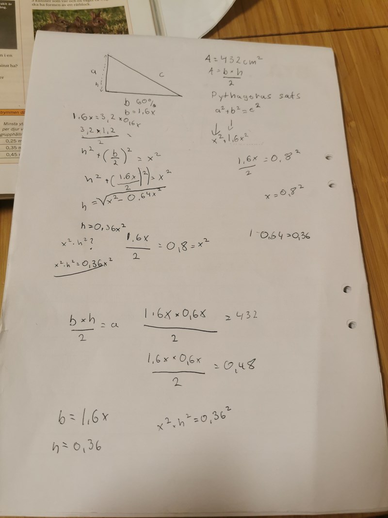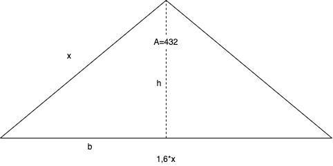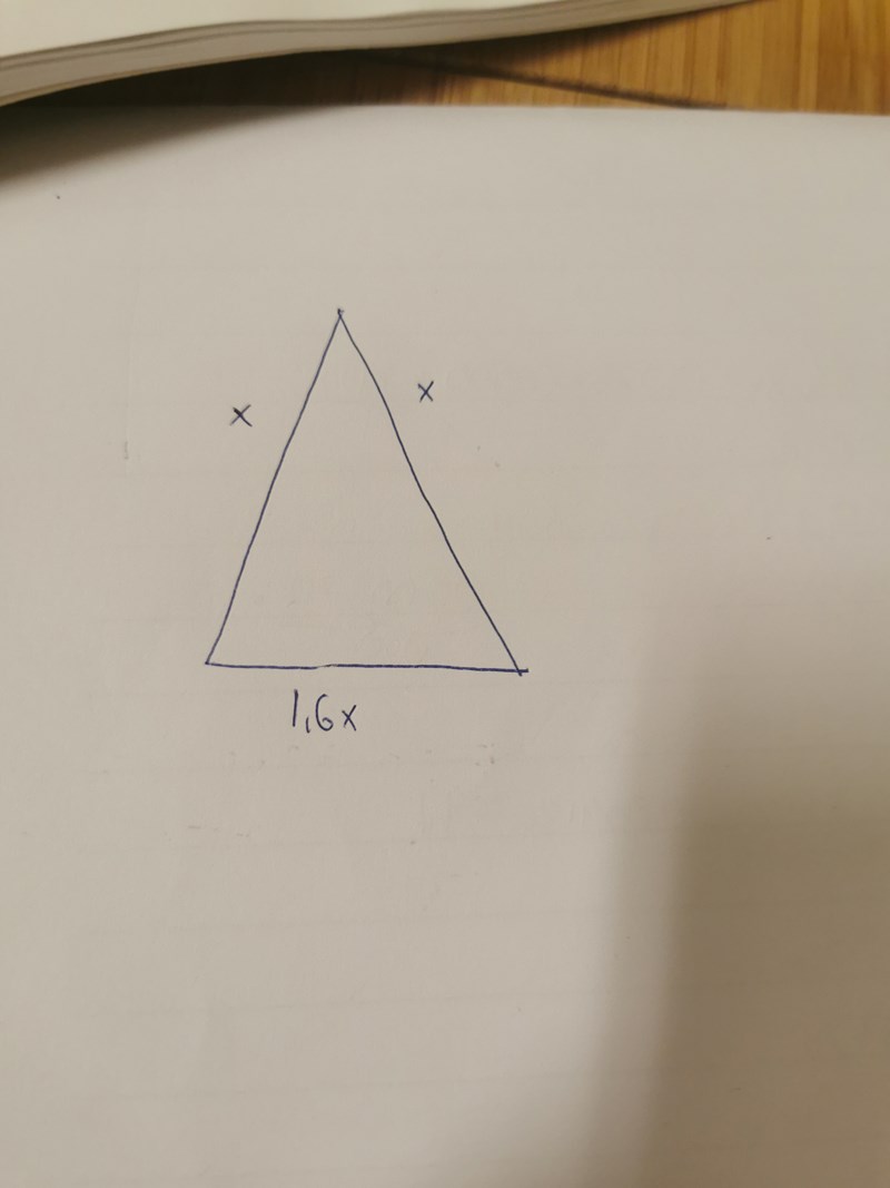 Den andra kateten bör vara b? Basen på triangeln, dvs 1,6x. Hittils har jag 'x, h och 1,6x. Höjden vet vi inte så den står också som x än så länge?