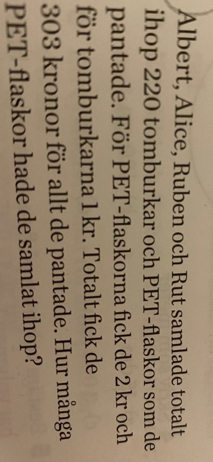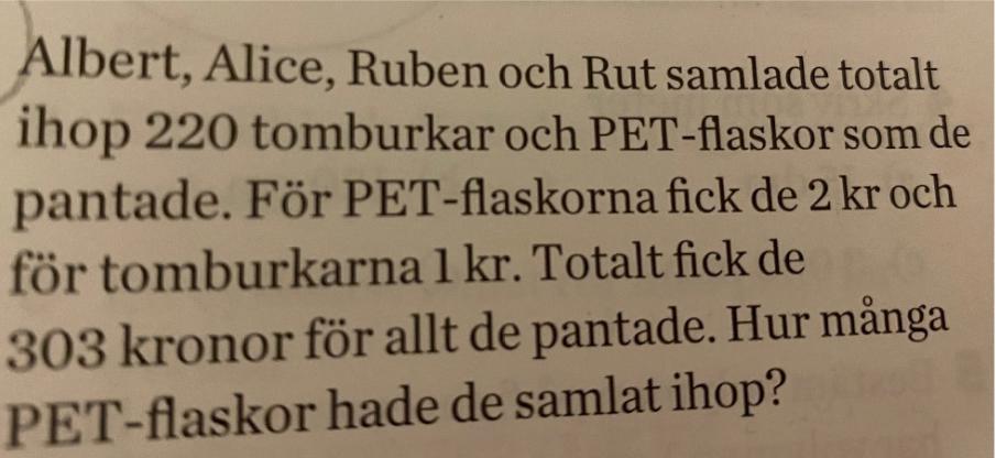 Jag skulle kunna byta ut y mot 220-x så att jag får 2x+220-x=303, alltså få att x är lika med 83. Så de samlade alltså ihop 83 Pet-flaskor?