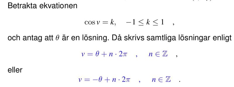 Men nu är jag (åter) i ett läge där mitt svar inte stämmer med facit. Deras två alternativ är x=n*2pi eller x= pi/2 + n*2pi. Jag fattar inte. X motsvarar 90 grader. Så efter 90 grader finns det ett svar, sen plus varje 180 grader finns det ett till svar. 180 grader= pi. Varför är då deras svar n*360 grader? Och 90 grader + n*360 grader hoppar ju över svaret för 270 grader? Vad har jag rört ihop?