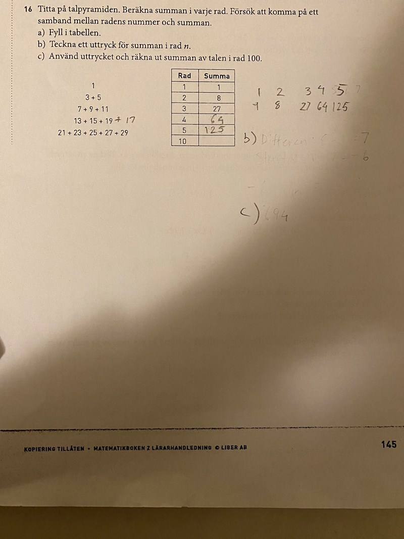 jag har fyllt i tabellen men förstår inte hur jag ska teckna ett uttryck för summan i rad n