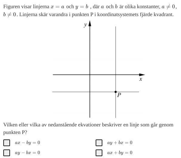 och då har vi ett negativt y-värde men ett positivt x-värde så linjen kommer passera punkten i fjärde kvadranten. Det stod dock "alla rätt" när jag skulle rätta svaret. Så jag vet inte om det stämmer att alla alternativ är rätt eller om jag har resonerat rätt. Hur löser man uppgiften ens?