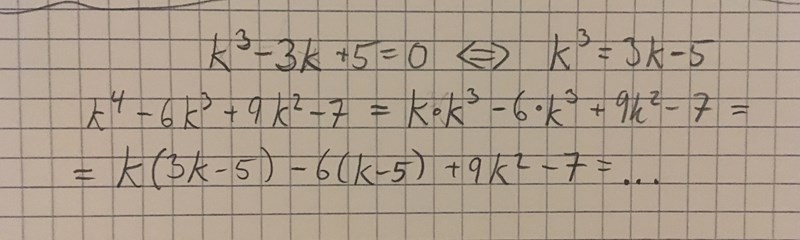 Bestäm k^4 - 6k^3 + 9k^2 - 7 om k^3 - 3k + 5 = 0.