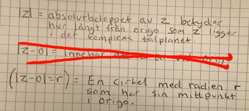 Trinity2 skrev:Jag tycker |z|=r är ett utmärkt svar. Sådan förståelse kommer väl till pass när man skall lösa ekvationer som |z|=|z-4|.