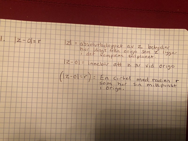 Dvs att du ska skriva z = a+bi och sedan beskriva cirkelns ekvation med hjälp av a, b och r