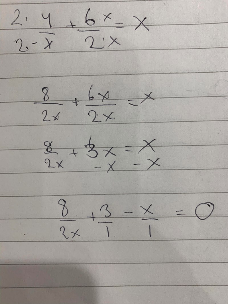 I det här fallet tycker jag att nämnare är ganska besvärliga, så de vill jag gärna bli av med. Om jag då multiplicerar först med 2 och sedan med x, eller först med x och sedan med 2, eller direkt med 2x ger precis samma resultat. (Själv skulle jag multiplicera med 2x direkt.) Hur ser ekvationen ut när du har gjort dessa eller detta steg?