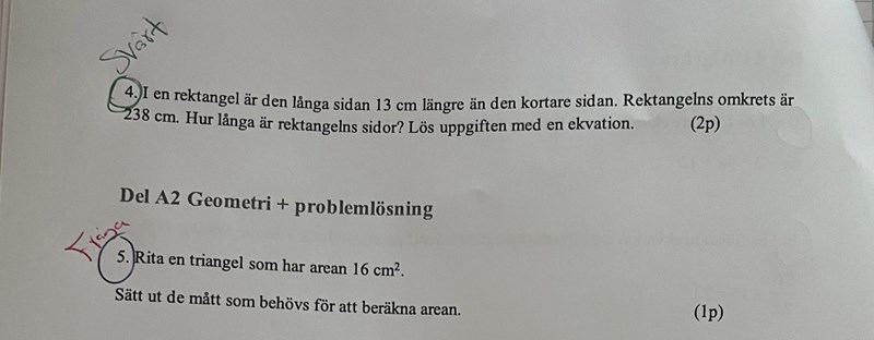 För att börja på fråga 4 ritar man en rektangel och sätter ut mått eller symboler för de fyra sidorna.